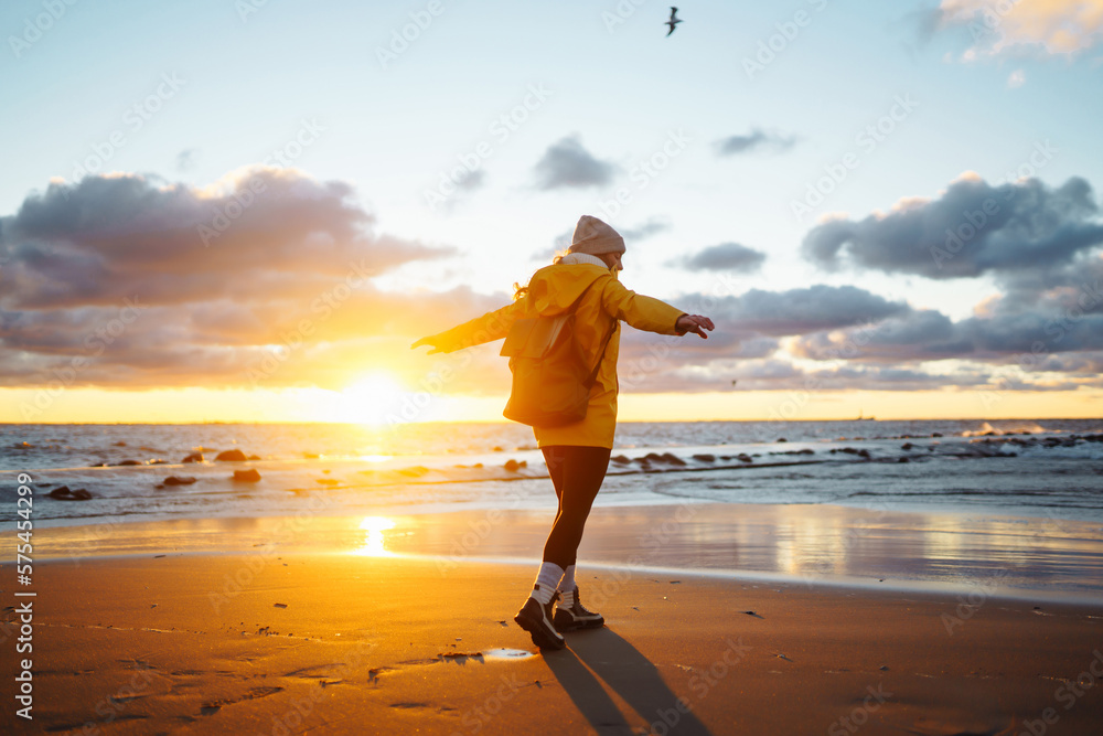 Pretty female traveler walks on shore near tranquil sea at sunser. Nature paradise