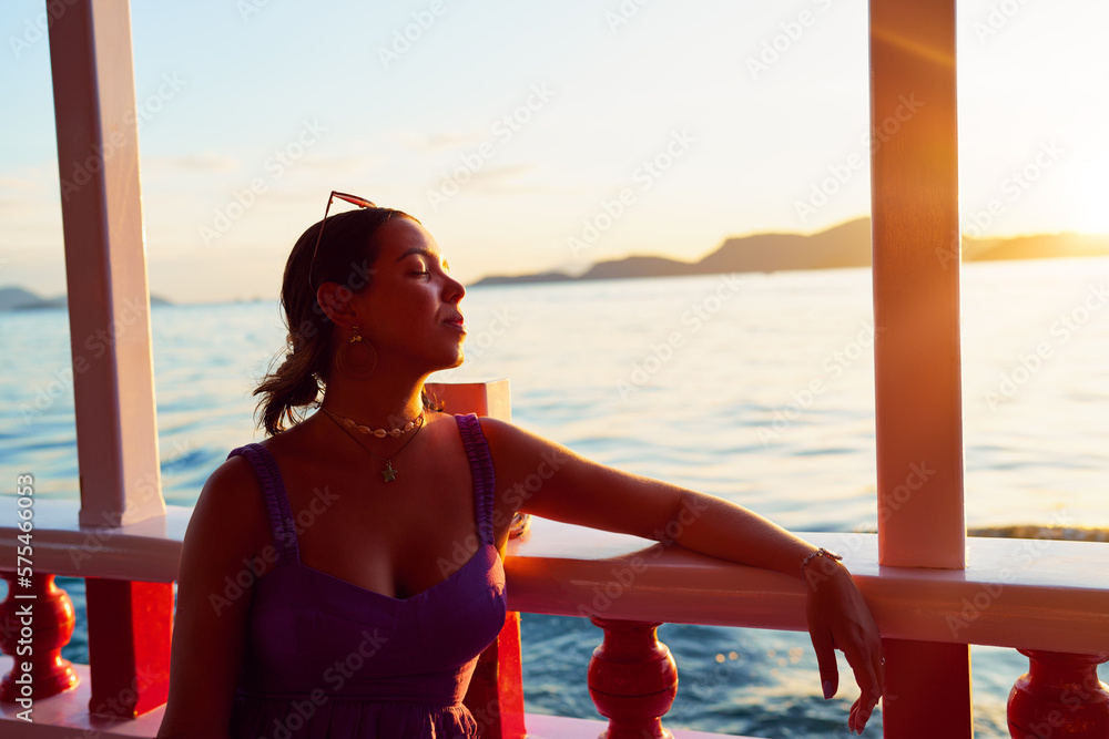 portrait young brazilian woman traveling on a boat sitting with eyes closed enjoying the breeze and sunset over the ocean in Angra dos Reis Brazil