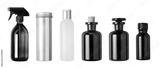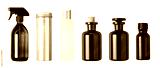 various blank bottles and containers - spray bottle, aluminium tin with screw lid, amber glass bottles and a white one, isolated packaging design elements, front view
