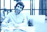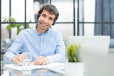 Smiling friendly handsome young male call centre operator.