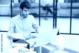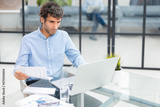 Young man is working with papers while sitting in the office. Successful entrepreneur is studying documents with attentive and concentrated look. Collegue is on the background.
