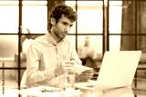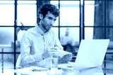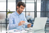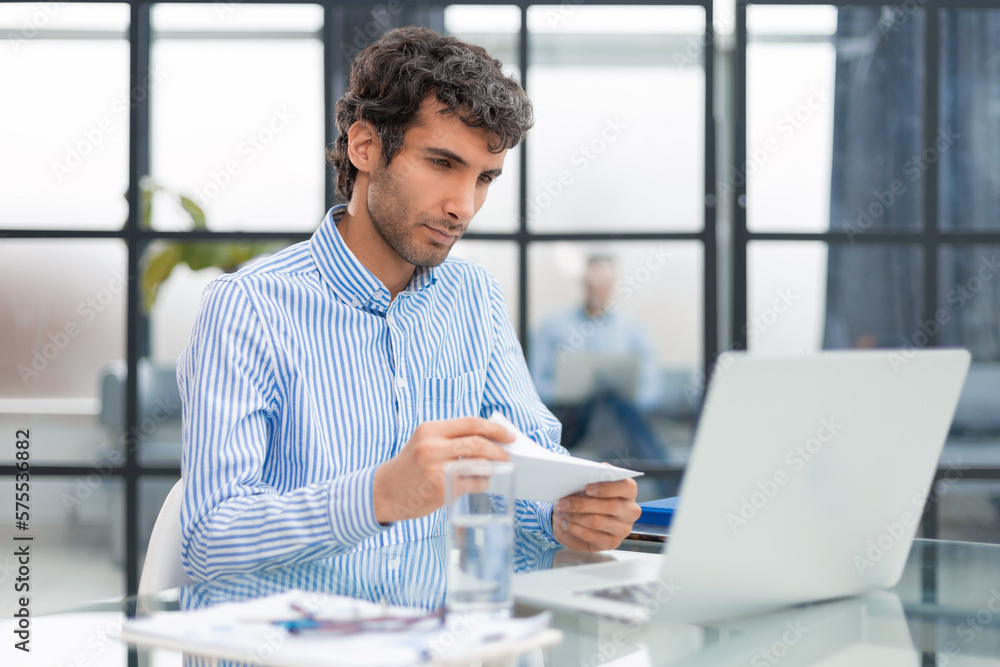 Entrepreneur opening an envelope in a desktop at office. Collegue is on the background.