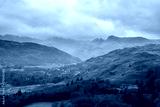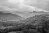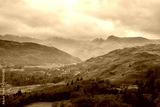 Stunning Winter sunrise landscape view from Loughrigg Fell towards Langdale Pikes and Pike O'Blisco in the Lake District