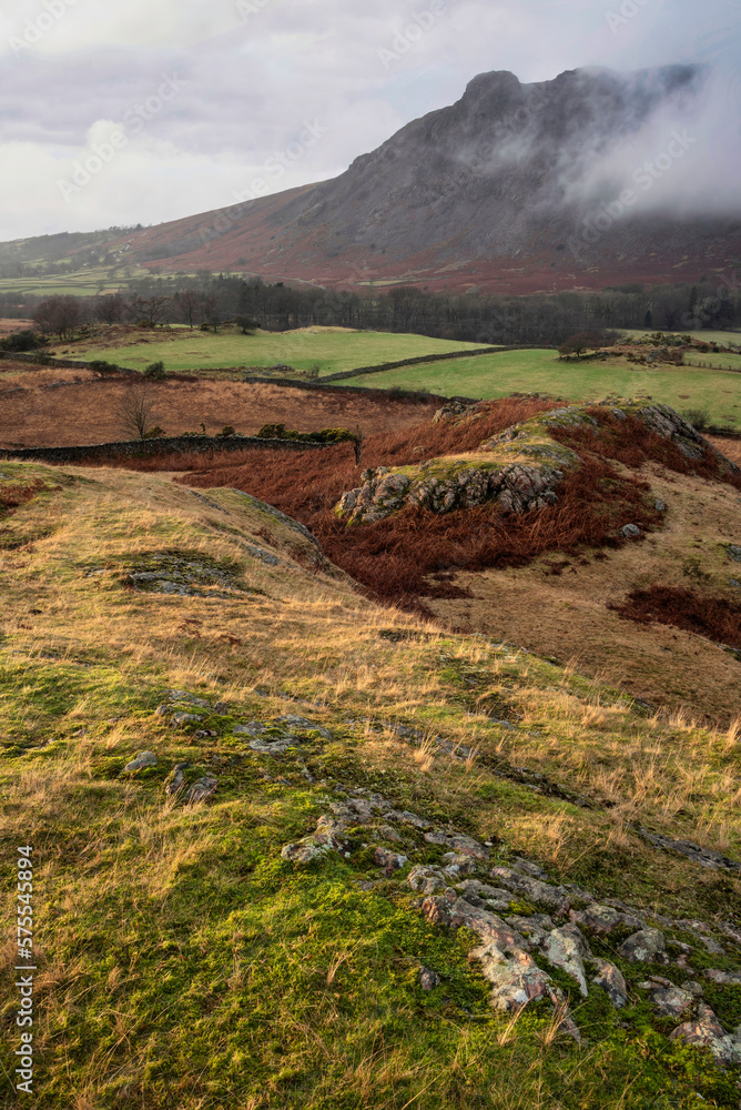 Stunning Winter sunset golden hour landscape image of view from Wast Water over countryside in Lake District towards the Western district