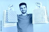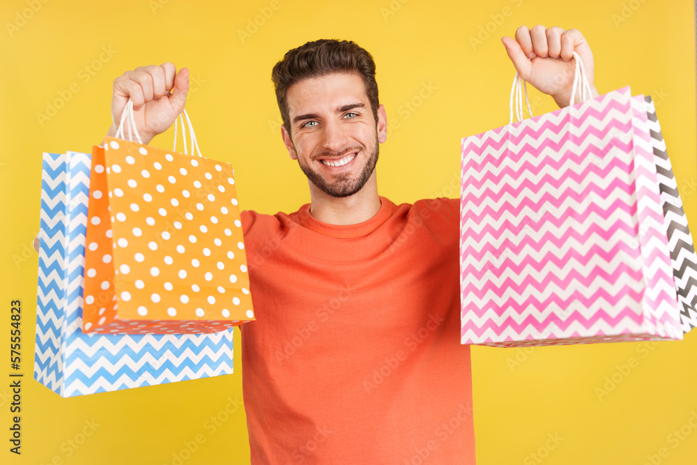 Caucasian man raising many shopping bags while smiling