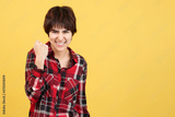Androgynous person celebrating while raising one fist