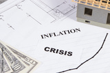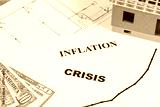 Inscriptions crisis and inflation, currencies Dollar, toy house under construction and construction drawings. High prices of real estate and building home