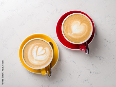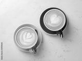 Two Cappuccino coffee with heart drawing at yellow and red cup on white marble table top view