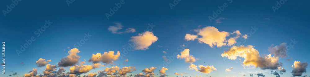 Dark blue sunset sky panorama with Cumulus clouds. Seamless hdr pano in spherical equirectangular format. Complete zenith for 3D visualization, game and sky replacement for aerial drone 360 panoramas.