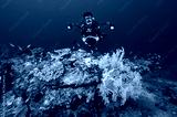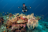 Male scuba diver with camera taking a photo with beautiful coral reef and marine life at North Andaman, a famous scuba diving dive site and stunning underwater landscape in Thailand.