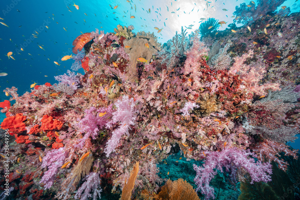 Beautiful colorful soft coral reef and marine life at North Andaman, a famous scuba diving dive site and exotic underwater landscape in Thailand.