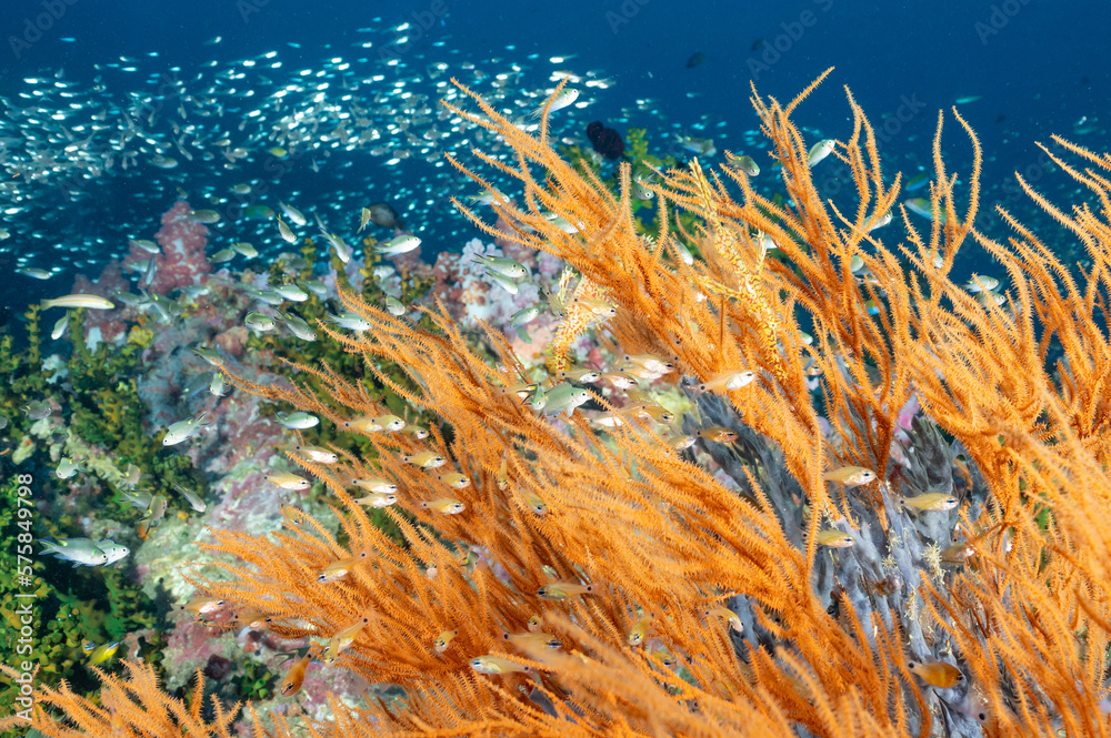Two ghost pipefish in orange Gorgonian coral with school of fish surrounded. Marine life and underwater world concept