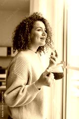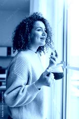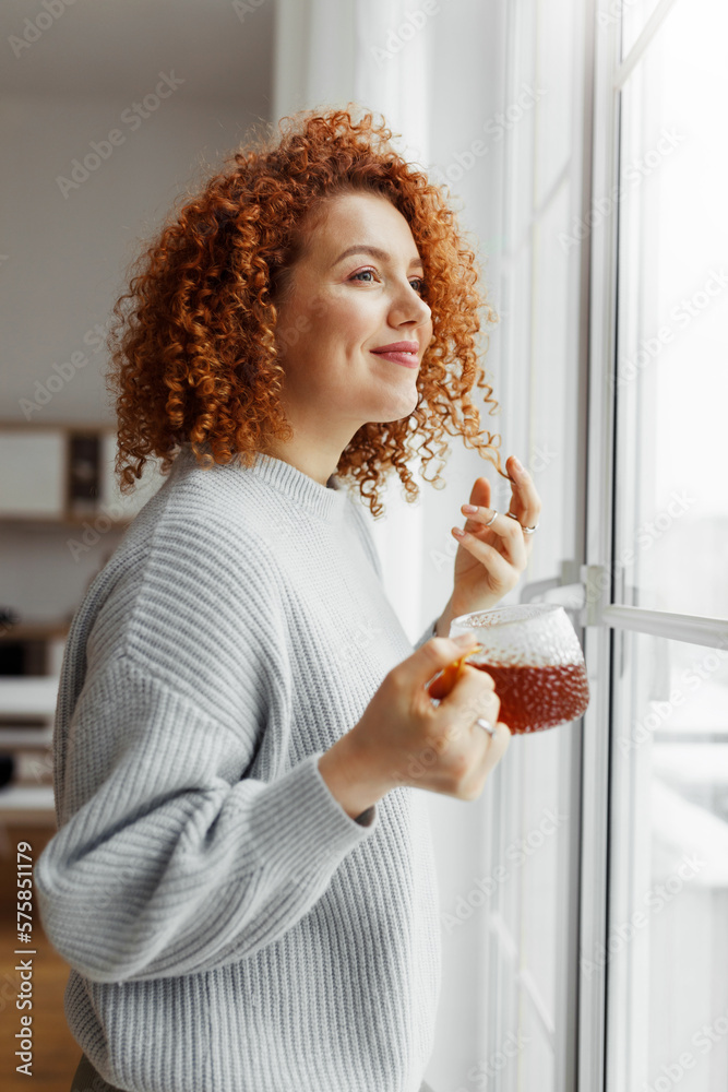 Vertical portrait of gorgeous redhead curly female in sweater drinking hot tea to warm up admiring beauty of snowy winter standing next to big window and looking through touching her hair