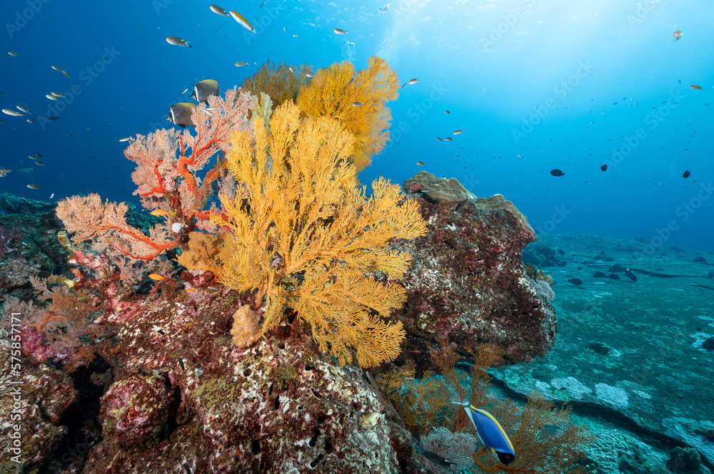 Colorful Branching Gorgonian Sea Fan coral (Seafan) on the rock with marine life at Tachai Pinnacle, a famous scuba diving dive site of North Andaman and stunning underwater landscape in Thailand.