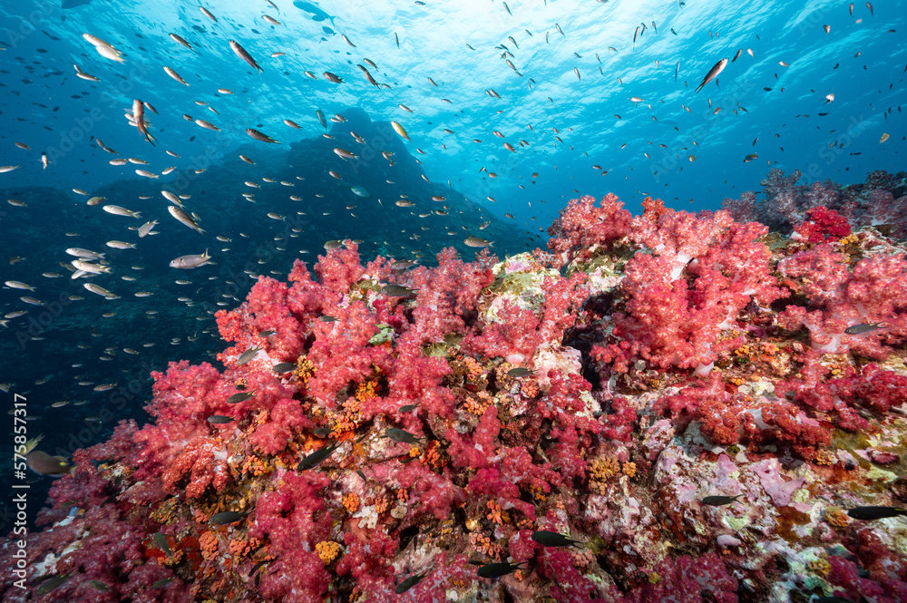 Beautiful pink soft coral reef and school of fish at Richelieu Rock, a famous scuba diving dive site of North Andaman. Stunning underwater landscape in Thailand.