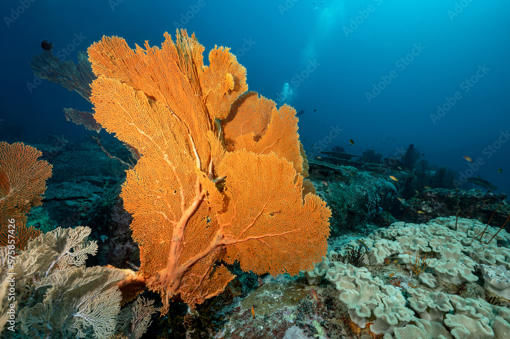 Branching Gorgonian Sea Fan coral or Giant Seafan with marine life at North Andaman, a famous scuba diving dive site and exotic underwater landscape in Thailand.