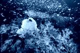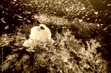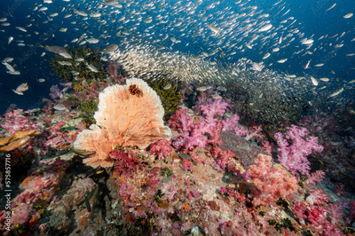 Branching Gorgonian Sea Fan coral (Seafan), colorful soft coral and school of fish at Richelieu Rock, a famous scuba diving dive site of North Andaman. Exotic underwater landscape in Thailand