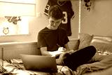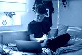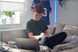 Caucasian teenager boy sitting on bed and learning using laptop