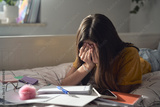 Caucasian teenage girl sitting on bed with head in hands and trying to learn