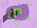 Creative art collage with hands holds camera. Modern social media content and popularity concept.