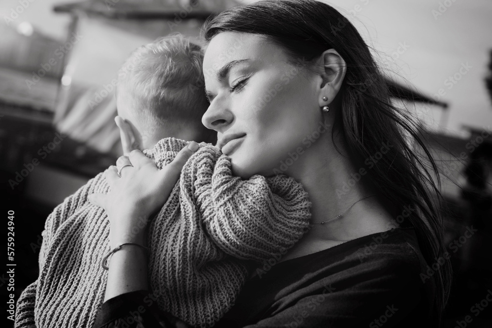 beautiful caucasian young woman couple holding baby son at the quay of city Saint-Petersburg, Russia