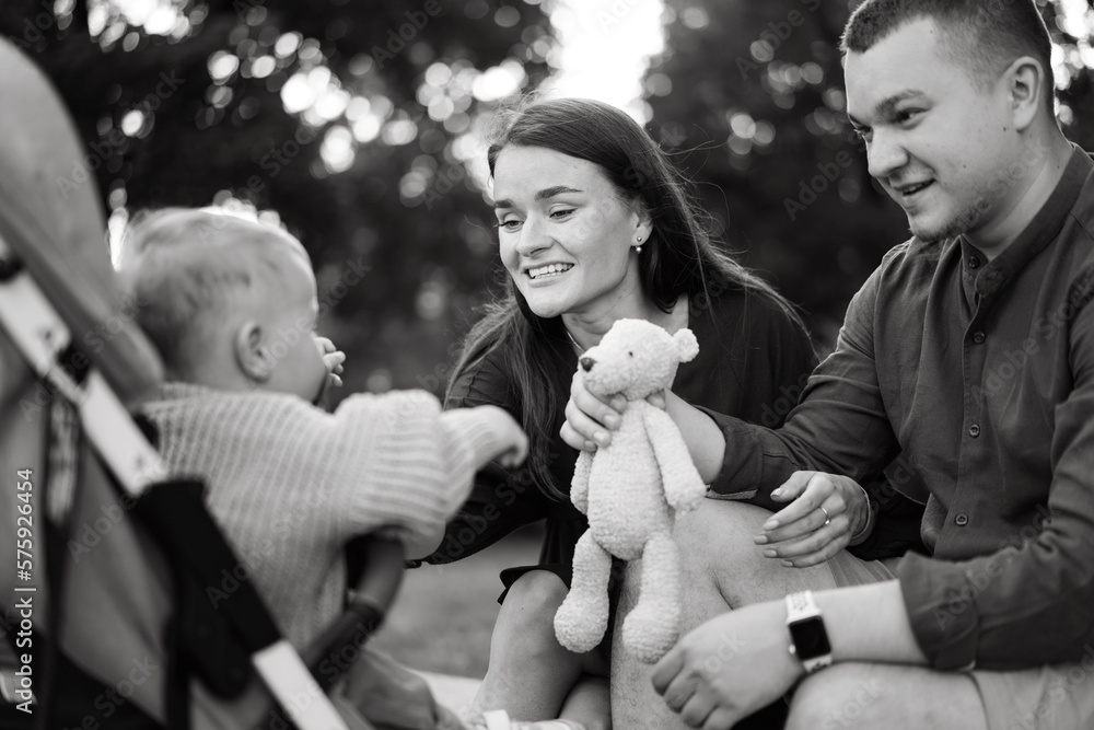 Baby boy sitting in a stroller,young parents on background, sitting at stone balustrade, looking at him with tenderness