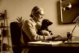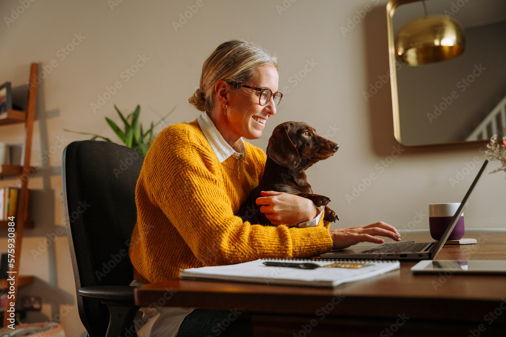 Caucasian female free lance worker working from home holding pet dog on her lap