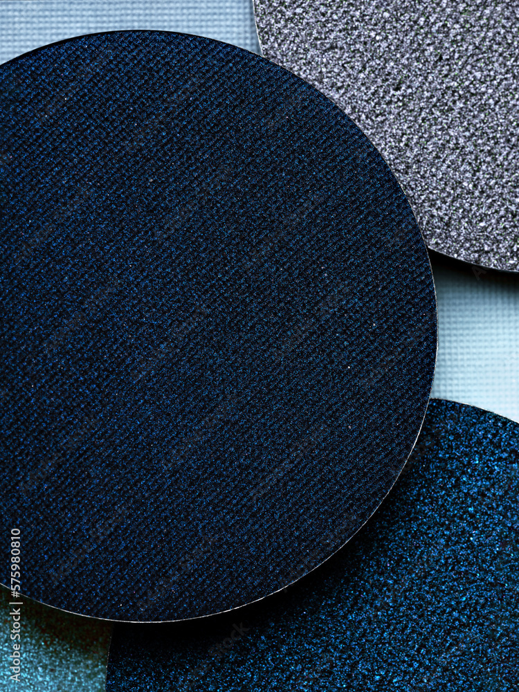 An abstract blue eyeshadow macro photo. A top view close-up of a compact makeup palette. A professional picture of minimalistic round design, shimmer texture and a blue color of the eye shadow.