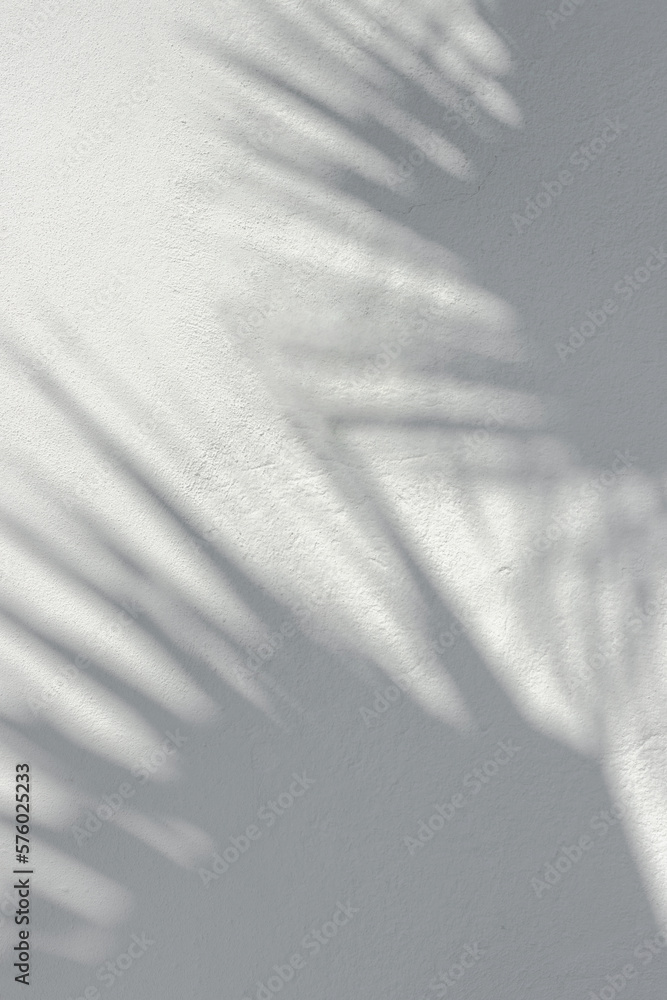 Palm tree leaves soft shadow on white concrete wall. Textured background for design