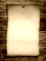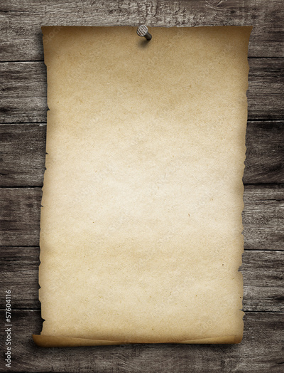 old wanted paper or parchment pinned by nail to grunge wooden ba