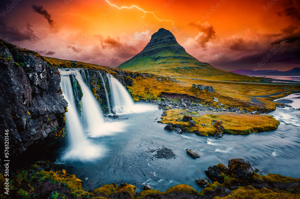 Lightning illuminates ominous storm clouds over Kirkjufell volcano. Iceland, Europe.
