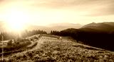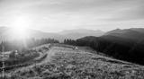 Majestic view of the sunrise over the mountain ranges. Carpathian mountains, Ukraine.