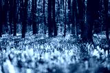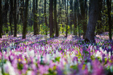 Spring glade in forest with flowering Corydalis cava in sunny day.