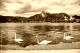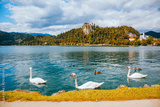 Swans floating on the lake Bled, in the background the castle Blejski grad on a high cliff.