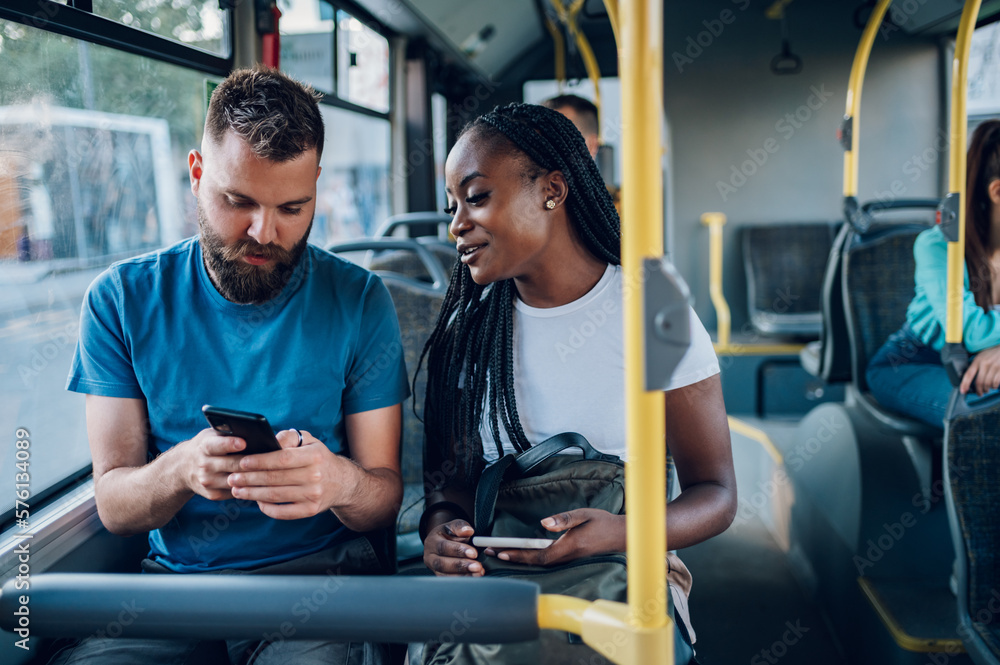 Multiracial friends talking and using a smartphone while riding a bus in the city