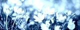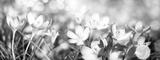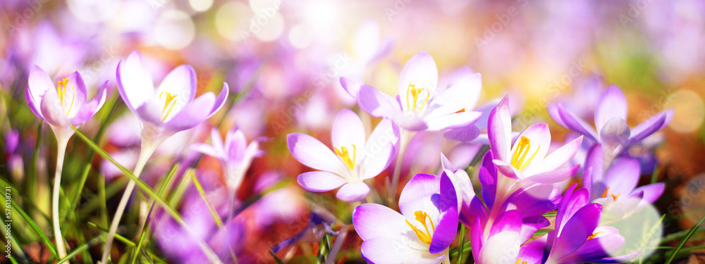 Blooming purple crocus flowers in a soft focus on a sunny spring day