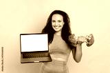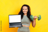Positive beautiful latino or brazilian young athletic woman with curly hair, holding imaginary broccoli kettlebell, laptop with blank white screen, standing on isolated yellow background, smiling