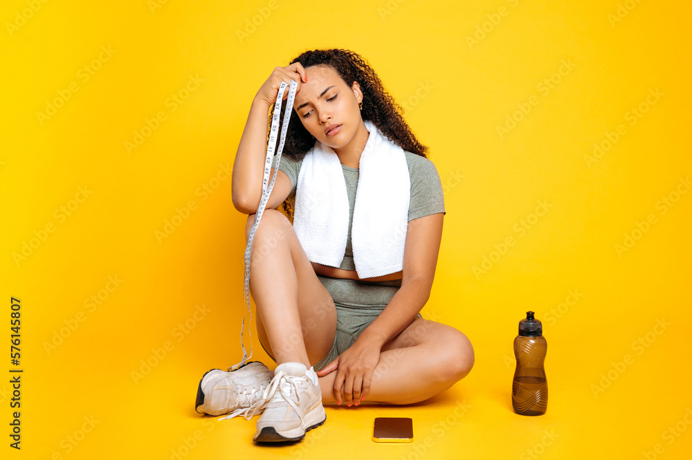 Full length exhausted mixed race young woman in sports outfit, with centimeter in a hand, sitting on isolated yellow background, sadly looks down, tired after workout, upset with the result