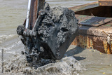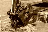Dredging the bottom of water area, view of the bucket of the floating excavator full of mud