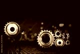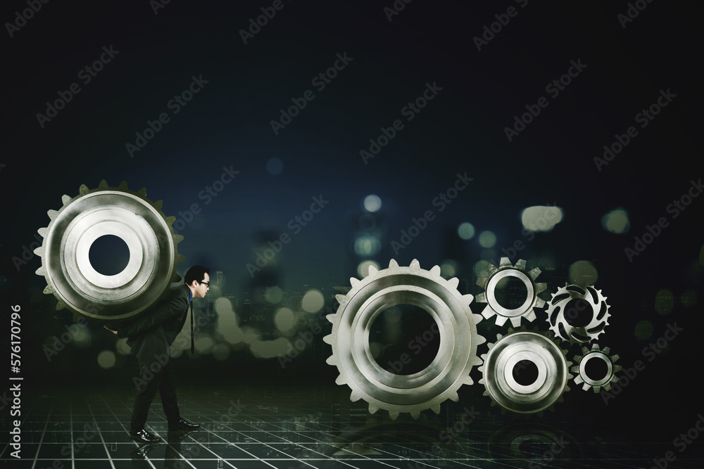Businessman carrying cog wheels