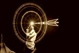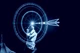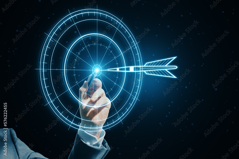 Target concept with a glowing hologram of bullseye and arrow hitting the center. Growth strategy. Goals achievement, success. Close up of businessman hand using hud screen on blurry dark background.