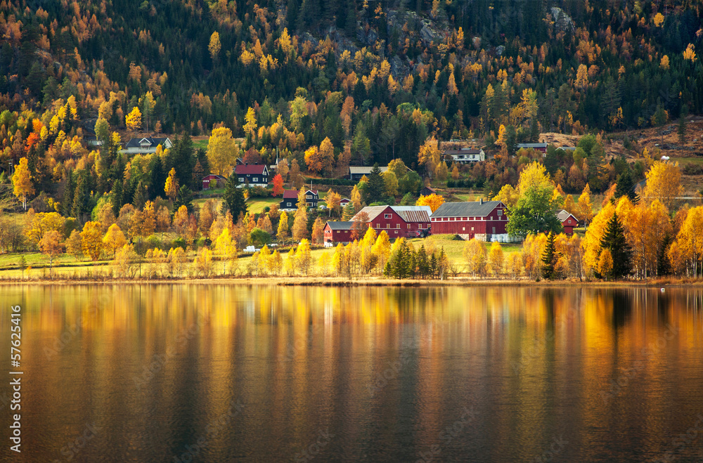 Norwegian autumn landscape with country houses