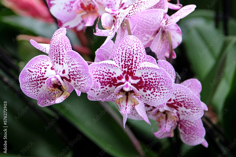 Purple and white speckled phalaenopsis moth orchids in flower.