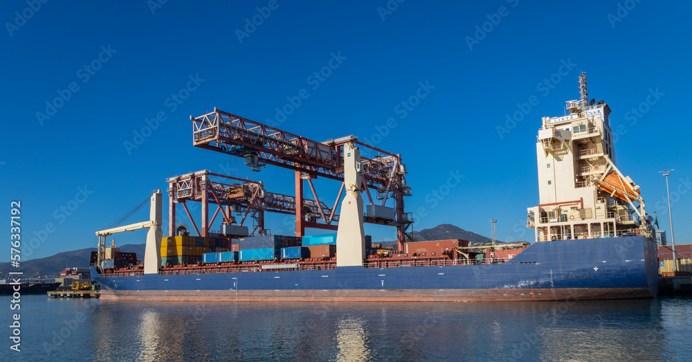 GENOA, ITALY, FEBRUARY 2, 2023 - A long container ship with big cranes moored in the port of Genoa, Italy
