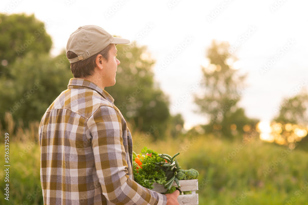 Farmer with a vegetable box in front of a sunset agricultural landscape. Man in a countryside field. Country life, food production, farming and country lifestyle concept.