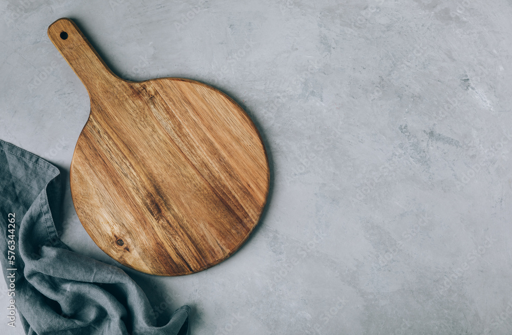 Chopping board. Empty round wooden cutting board with napkin on gray stone background