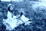 Portrait of pretty young redhead young woman wearing straw hat and white dress sitting posing with laptop computer looking at camera, on beautiful field of green grass on summer sunny day.