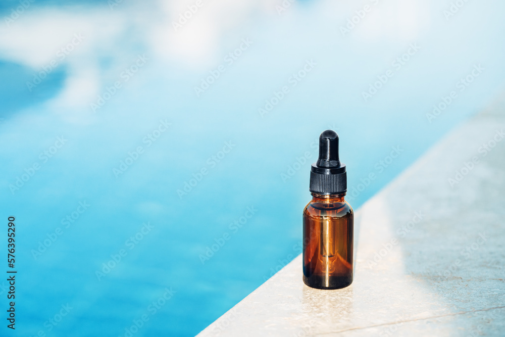 Natural medicine or essential aroma oil or beauty essence amber glass vial with dropper near blue water in sun. Face and body spa serum care concept banner. Hydration and moisturizer