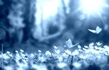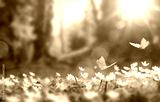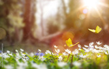 Forest glade with lots of white spring flowers and butterflies on a sunny day