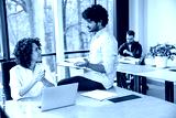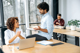 Teamwork concept. Two successful employees of the company of different nationalities are working together on a project using a laptop, in a modern office, analyzing solutions to achieve goals
